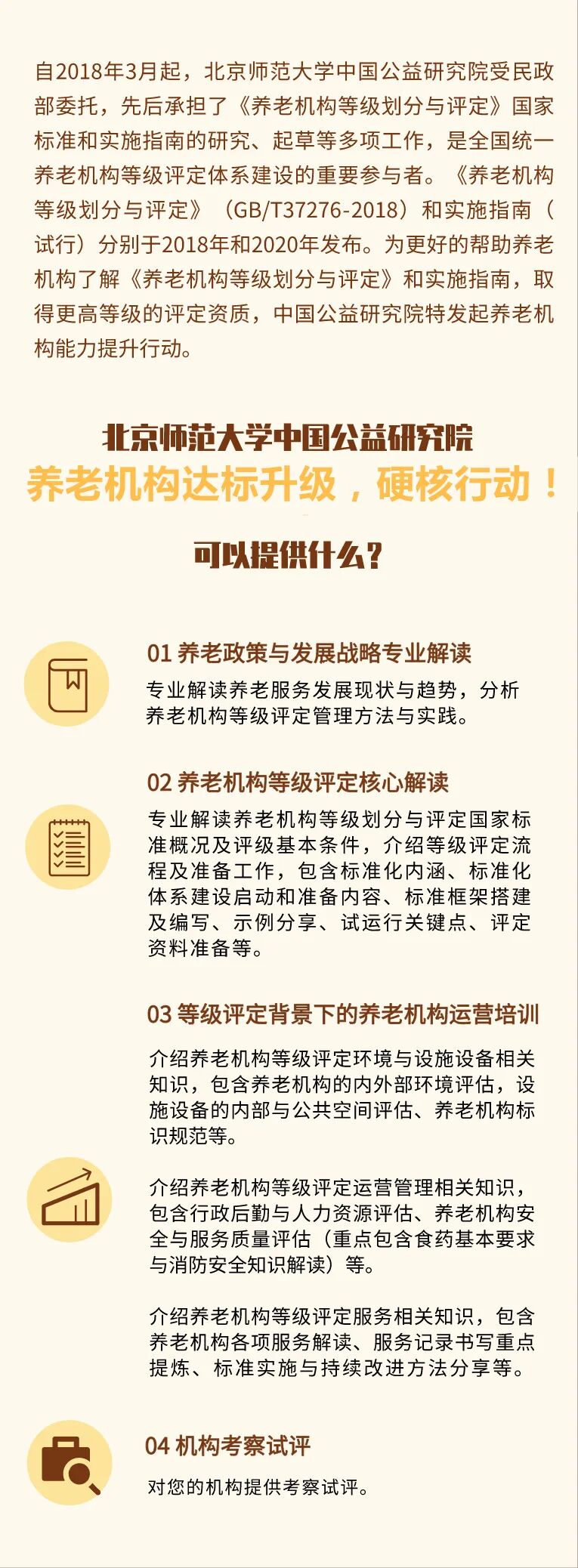 记《养老机构等级划分与评定》国家标准 2017年3月22日 民政部等六部委首次提出“建立全面涵盖养老院服务质量的标准化和认证工作体系” 民政部、公安部、国家卫生计生委、质检总局、国家标准委、全国老龄办印发《关于开展养老院服务质量建设专项行动的通知》,启动为期四年的“养老院服务质量建设专项行动”。同时,六部委首次提出“加快养老院服务质量标准化和认证建设。建立全面涵盖养老院服务质量的标准化和认证工作体系,按照改革要求推进政府标准和市场标准科学供给,积极推进养老机构在‘企业标准信息公共服务平台’上公开服务标准,接受社会监督,推动形成养老院分类等级服务标准及监管机制,探索开展养老院服务质量认证工作”。 2018年3月21日 民政部等四部委部署“制定养老机构等级评定的国家标准和实施办法” 民政部、国家卫生健康委、应急管理部、国家市场监督管理总局印发《关于做好2018年养老院服务质量建设专项行动的通知》,提出“制定养老机构等级评定的国家标准和实施办法,探索建立全国统一的养老机构服务质量评价和认证制度,鼓励优秀的养老机构通过养老服务认证”“各地对辖区内普遍性服务质量问题,在及时发现、立即整改的基础上,要研究完善相关制度,建立健全养老机构服务质量提升的长效机制”。 2018年8月24日 2017年养老院服务质量建设专项行动取得显著成效,全国整治服务隐患19.7万项 民政部等四部门召开全国养老院服务质量建设专项行动推进会,通报2017年专项行动成果:通过开展全国养老院拉网式大检查,安全隐患大幅消除,全国整治服务隐患19.7万项,依法取缔、关停、撤并安全隐患严重、无法有效整治的养老院2000多家,养老服务能力明显提升,养老院内部管理更加规范,行业管理制度进一步健全,服务质量意识日益提升。通过一事一议的创新方式,2017年有1620家养老院通过了消防审验。 2018年12月28日 《养老机构等级划分与评定》国家标准正式发布 国家市场监督管理总局、中国国家标准管理委员会联合发布《养老机构等级划分与评定》(GB/T 37276-2018)国家标准,该标准将于2019年7月1日实施。随后,国家市场监督管理总局、国家标准化管理委员会召开新闻发布会,通报关于《养老机构等级划分与评定》等646项国家标准的发布情况。原民政部养老服务司养老服务监管处处长李邦华表示:今后养老机构可自愿申请进行等级评定,参与评定的机构,将按照综合服务能力从低到高划为一星到五星5个等级。下一步,民政部还会制订操作性细则和办法,推动标准于2019年7月1日正式实施。 2019年5月13日 启动全国养老机构等级评价工作,推行全国统一的养老机构服务质量等级评价制度 2019年5月13日,民政部、国家卫健委、应急管理部、市场监管总局印发《关于做好2019年养老院服务质量建设专项行动工作的通知》,提出“2019年下半年启动全国养老机构等级评价工作,推行全国统一的养老机构服务质量等级评价制度。各级民政部门要做好标准、细则和相关政策的宣传,建立评价实施制度,鼓励符合条件的养老机构参加等级评价,同时加大政策支持力度,力争在省域范围创建一批五星级养老机构、在市域范围创建一批四星或三星级养老机构、在县域范围创建一批二星级养老机构,发挥等级评定示范效应,推动形成养老机构等级管理长效机制。” 2019年5月23日 2018年专项行动通过开展大检查大整治推动整改服务隐患36万处 5月23日,民政部、卫生健康委、应急管理部、市场监管总局等四部门联合召开视频会议,部署2019年的全国养老院服务质量建设专项行动工作,通报2018年专项行动工作进展。2018年,通过开展大检查大整治,推动整改服务隐患36万处,全国养老院普遍存在的安全隐患得到有效遏制和集中处置。出台《养老机构服务质量基本规范》《养老机构等级划分与评定》等国家标准,推动各地建立养老服务标准化工作机构。 2019年12月31日 民政部发文推动《养老机构等级划分与评定》加速落地 民政部发布《民政部关于加快建立全国统一养老机构等级评定体系的指导意见》(民发〔2019〕137号),部署推动建立全国统一的养老机构等级评定体系。《指导意见》要求“到2022年,全国统一的养老机构等级评定体系基本建立,养老机构服务质量有新提升,公众对养老服务的安全感、满意度进一步提高”。《指导意见》提出养老机构等级评定工作三大原则:依据国标、分级实施;自愿申请、公开透明;综合施策、统筹推进。同时,《指导意见》还提出“要加强对评定组织和人员的培训,使其熟练掌握养老机构等级评定相关法律法规、政策标准和操作要求”。 2020年4月22日 养老院服务质量建设专项行动收官之年,重点推进养老机构等级评定体系建设 民政部、住房城乡建设部、国家卫生健康委、应急管理部、市场监管总局五部委印发《关于做好2020年养老院服务质量建设专项行动工作的通知》。《通知》要求各地推行全国统一的养老机构等级评定制度,组织开展先行先试。并再次强调:到2020年底,养老服务综合监管制度全面实施,全国统一的养老机构等级评定制度普遍推行,养老机构服务安全强制性国家标准实施准备工作有序开展,养老院重大安全隐患基本消除,养老院服务质量建设长效机制逐步健全,社会对养老服务满意度持续提升,老年